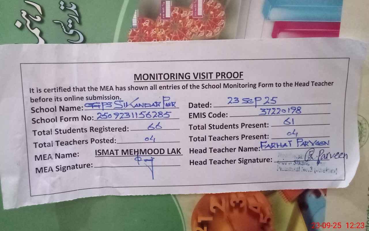 | EMIS Code: 37220198 | Name of School: GGPS SIKANDAR PUR | |||