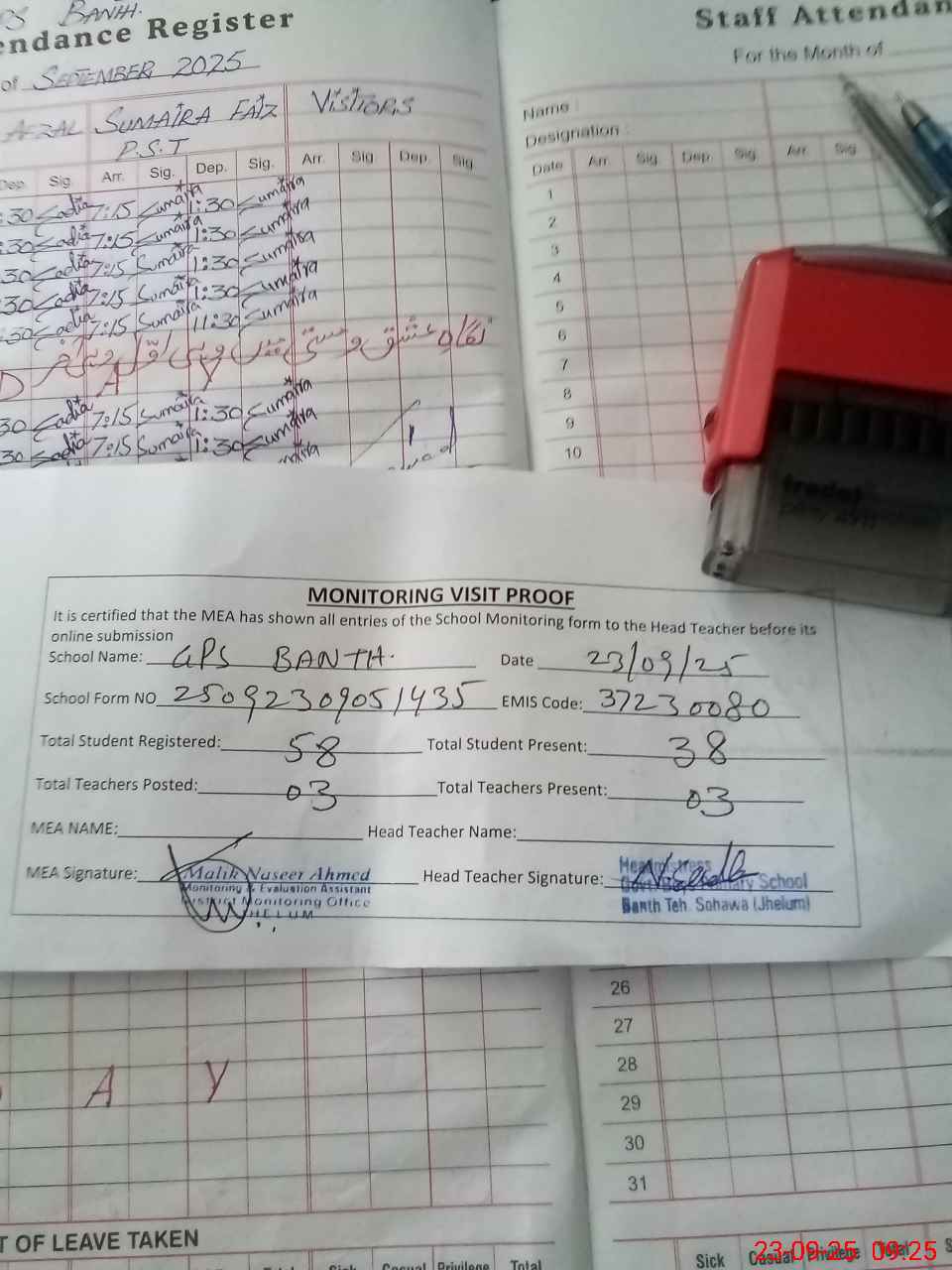 | Attendance Register | Head Teacher | MEA with School | Visit Proof |