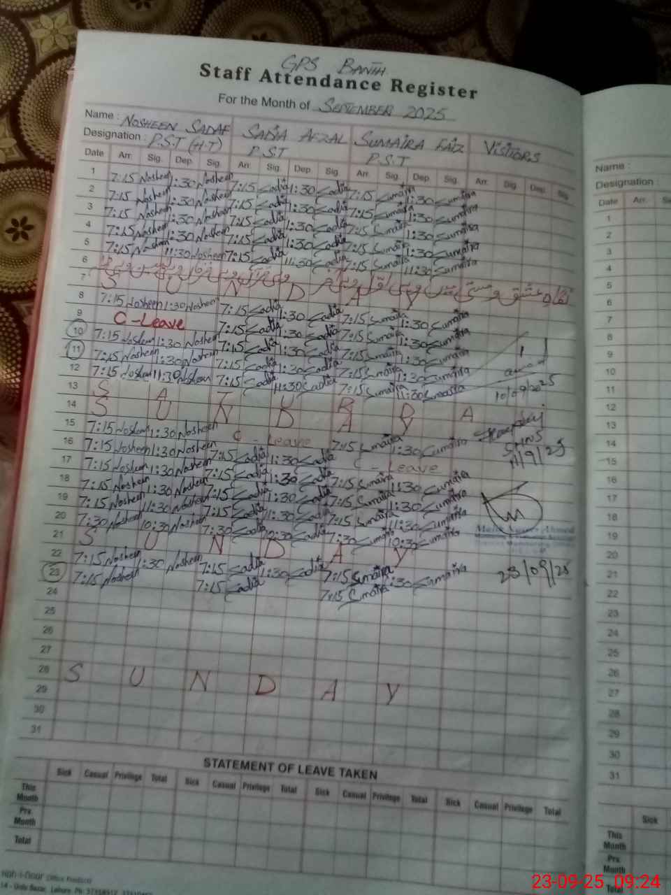 | CNIC | Full Name | Designation | R/C | Absence During Last Calender Month |