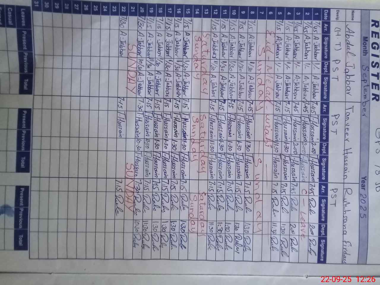 | CNIC | Full Name | Designation | R/C | Absence During Last Calender Month |