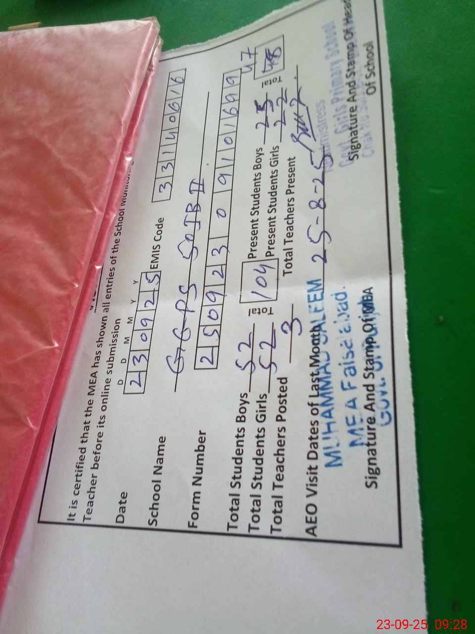 | Certified that this School was Inspected by the Undersigned MEA/DMO Today and the Information Stated Above is as Per Record. | |||||