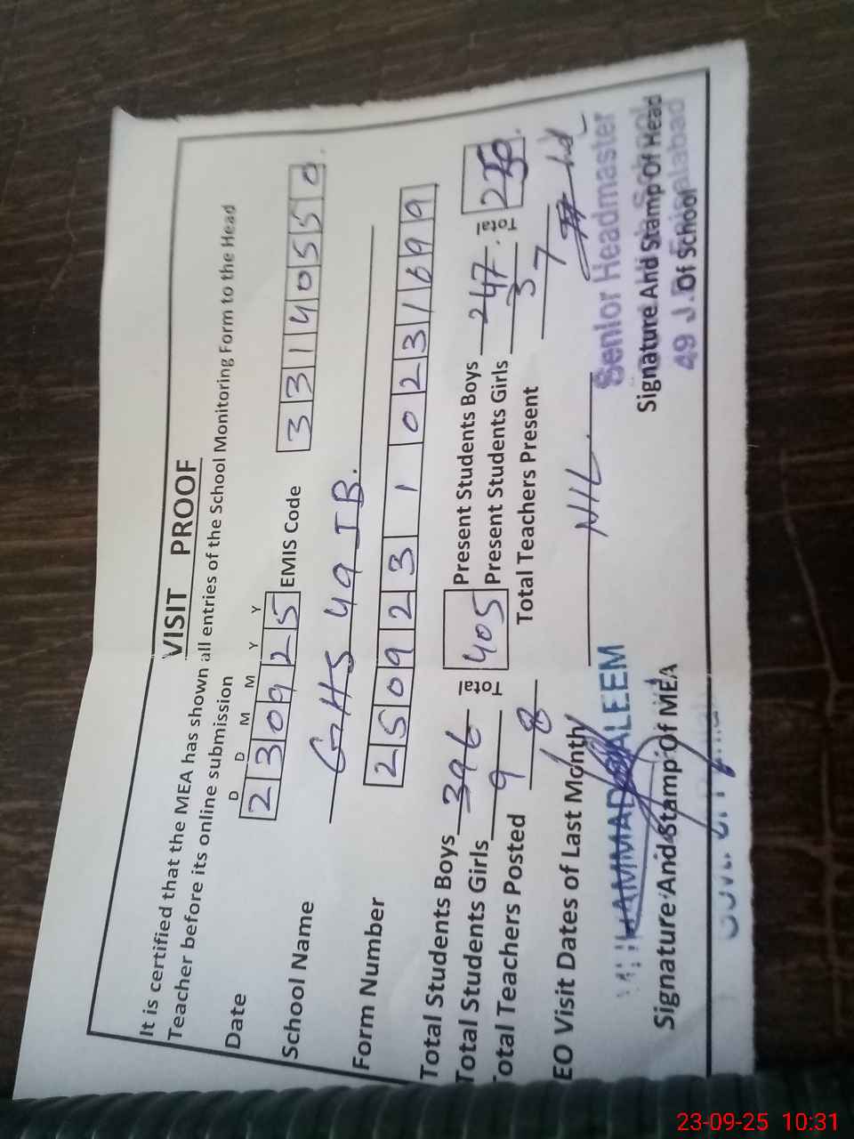 | Attendance Register | Head Teacher | MEA with School | Visit Proof |