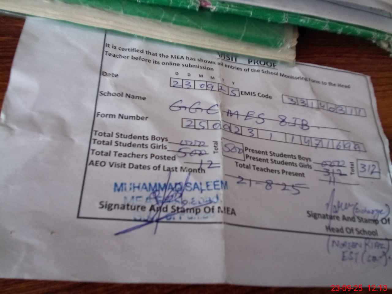 | Attendance Register | Head Teacher | MEA with School | Visit Proof |