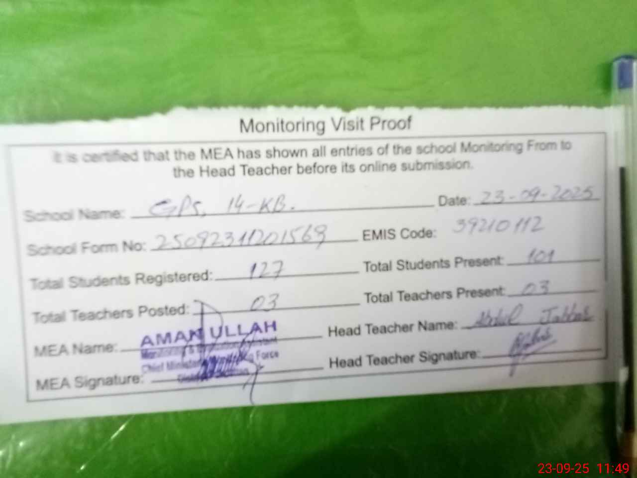 | Attendance Register | Head Teacher | MEA with School | Visit Proof |