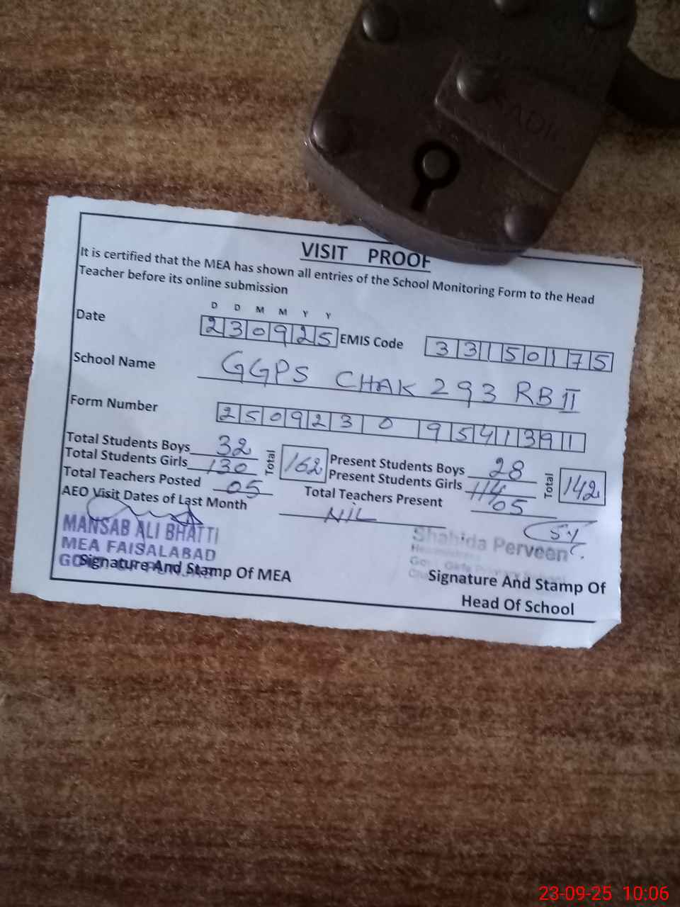 | Attendance Register | Head Teacher | MEA with School | Visit Proof |