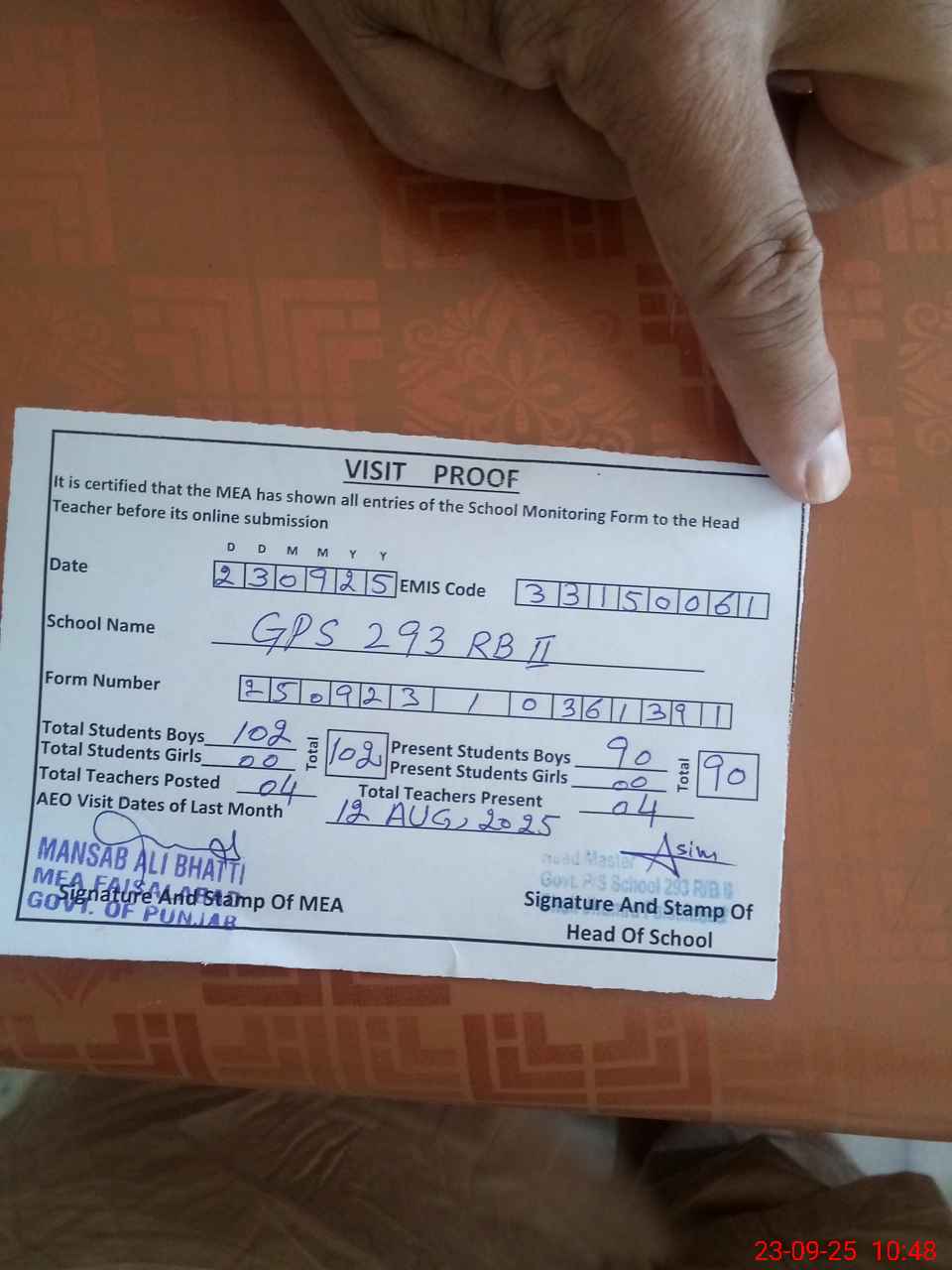 | Attendance Register | Head Teacher | MEA with School | Visit Proof |