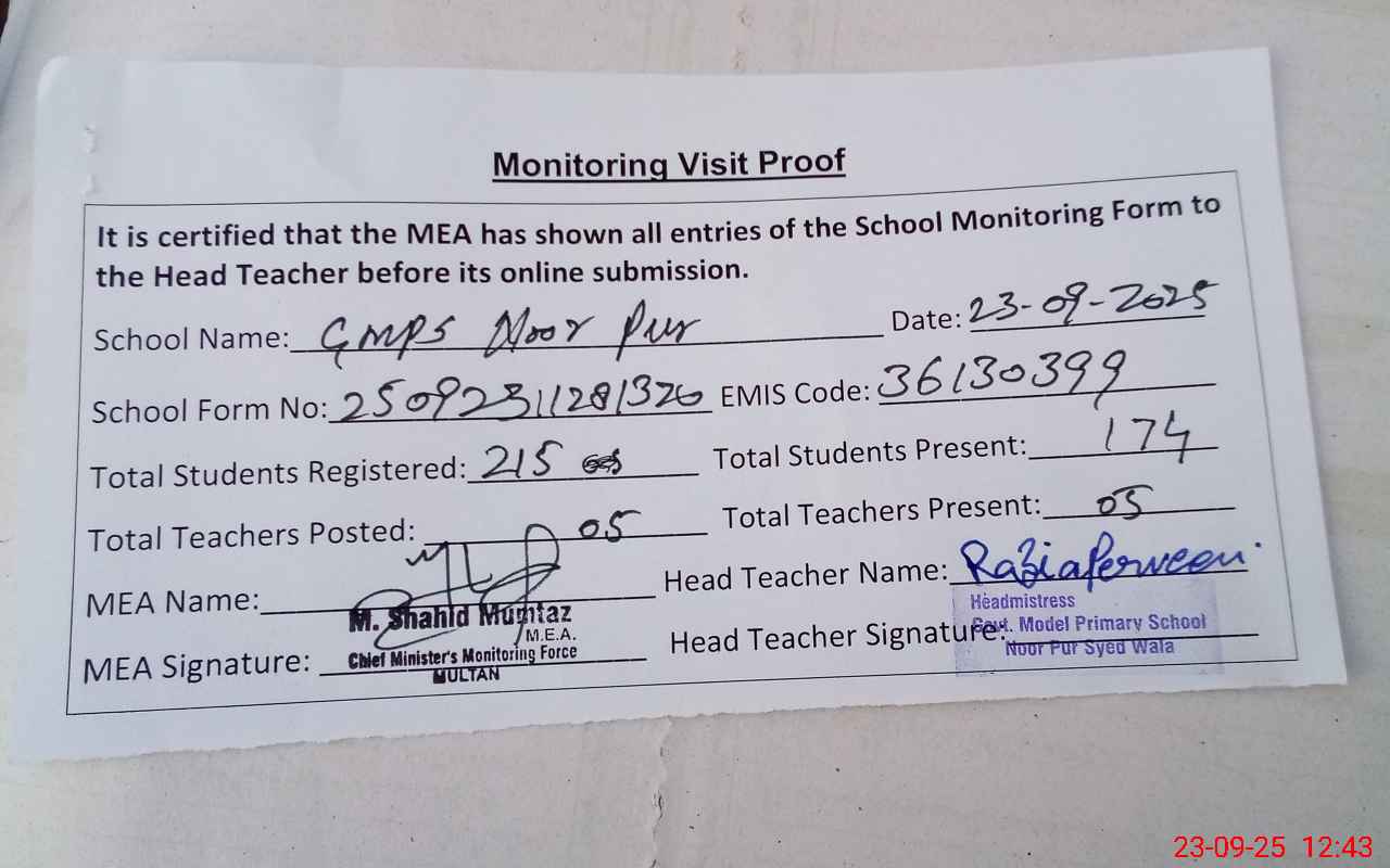 | EMIS Code: 36130399 | Name of School: GMPS NOOR PUR | |||
