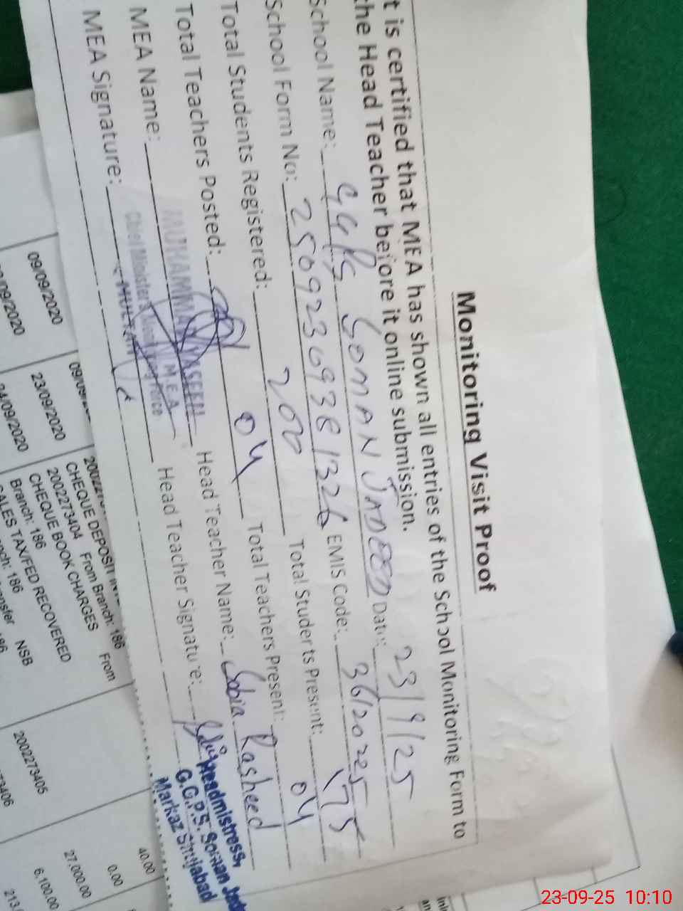 | Attendance Register | Head Teacher | MEA with School | Visit Proof |