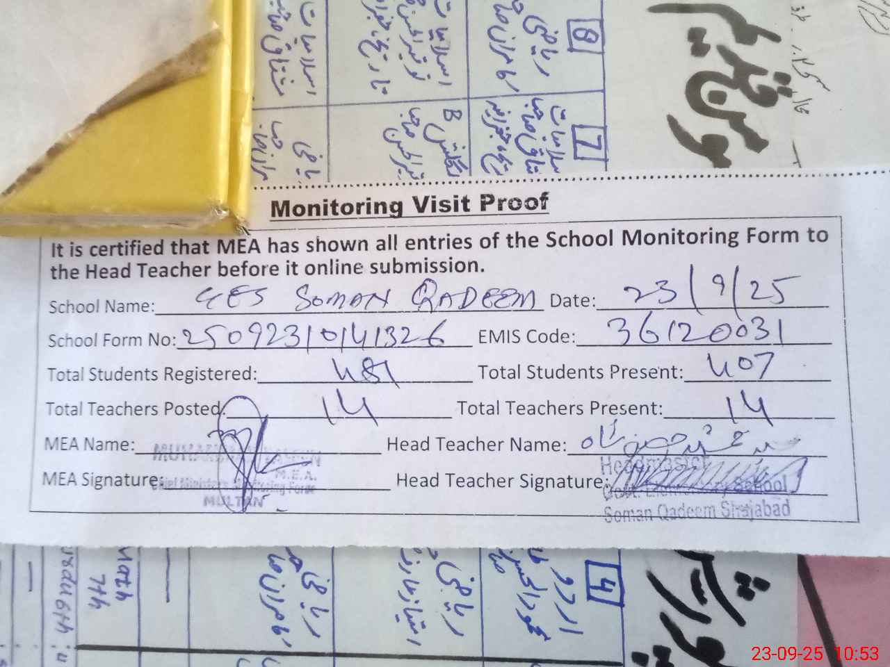 | Attendance Register | Head Teacher | MEA with School | Visit Proof |