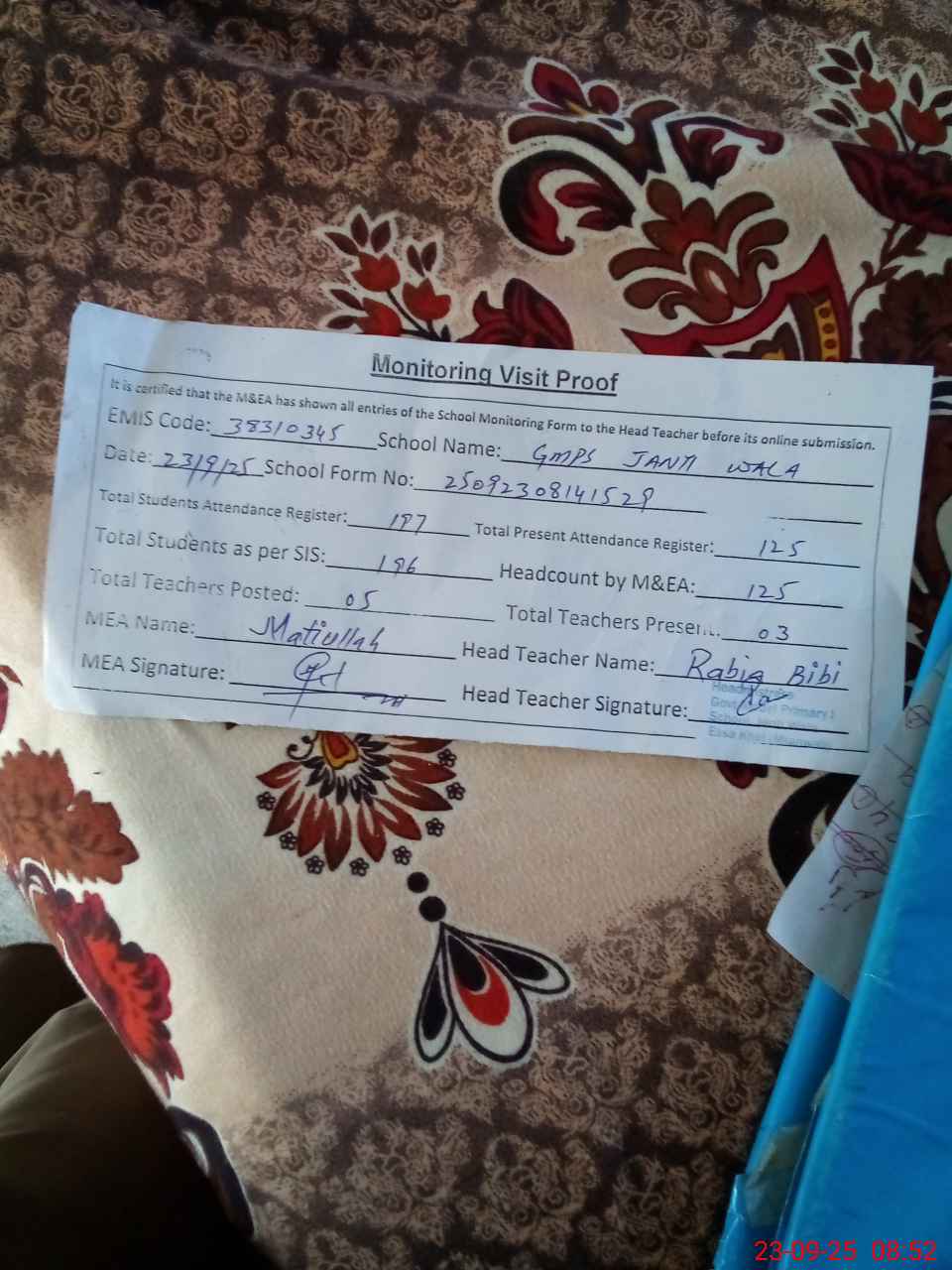 | Attendance Register | Head Teacher | MEA with School | Visit Proof |