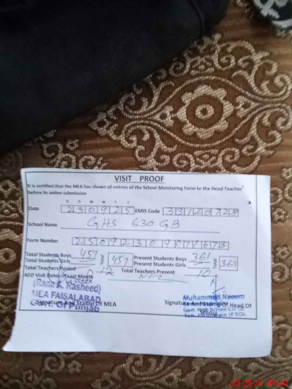 | EMIS Code: 33120728 | Name of School: GHS CHAK NO 630 GB | |||