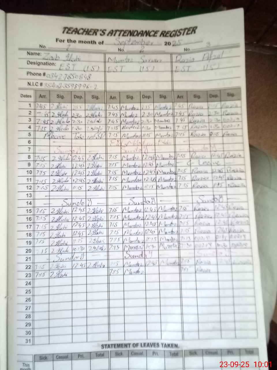 | Name: ZA**** IL**** Designation: (School Headmaster's/Headmistress's) Est Phone/Cell Number: 03**** |