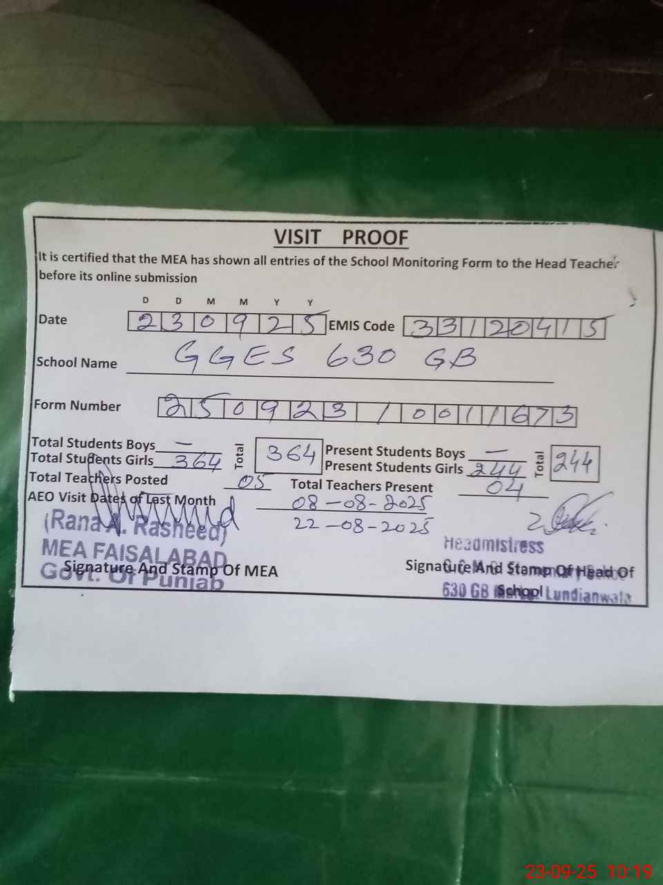 | Attendance Register | Head Teacher | MEA with School | Visit Proof |