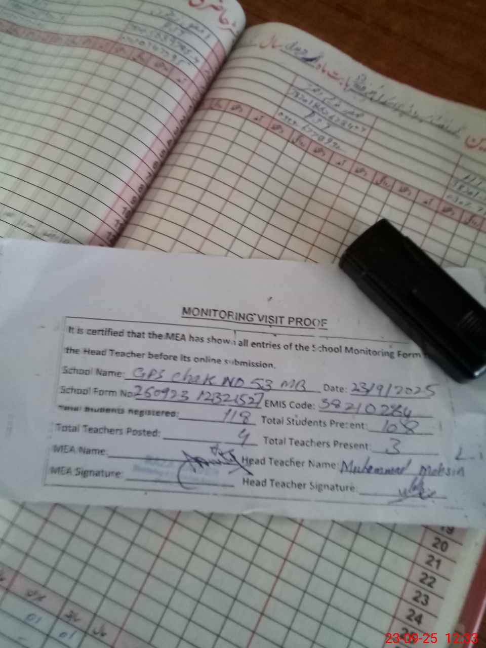 | Attendance Register | Head Teacher | MEA with School | Visit Proof |