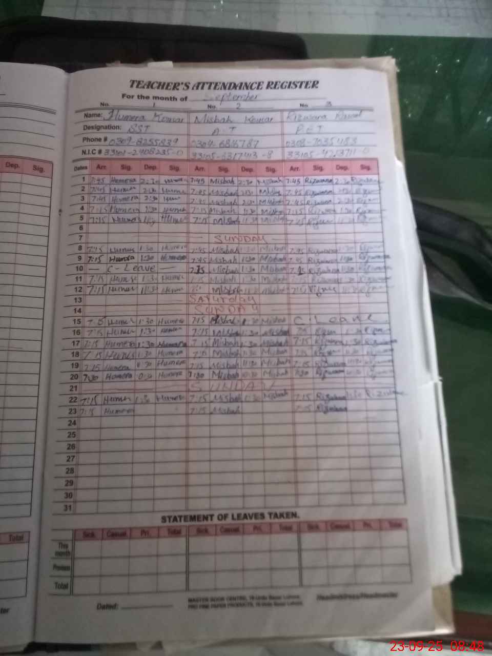| CNIC | Full Name | Designation | R/C | Absence During Last Calender Month |