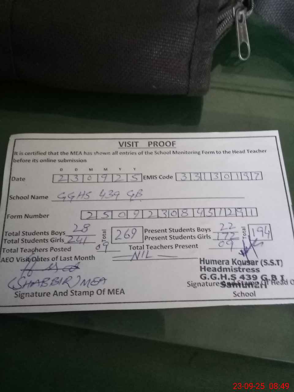 | Attendance Register | Head Teacher | MEA with School | Visit Proof |