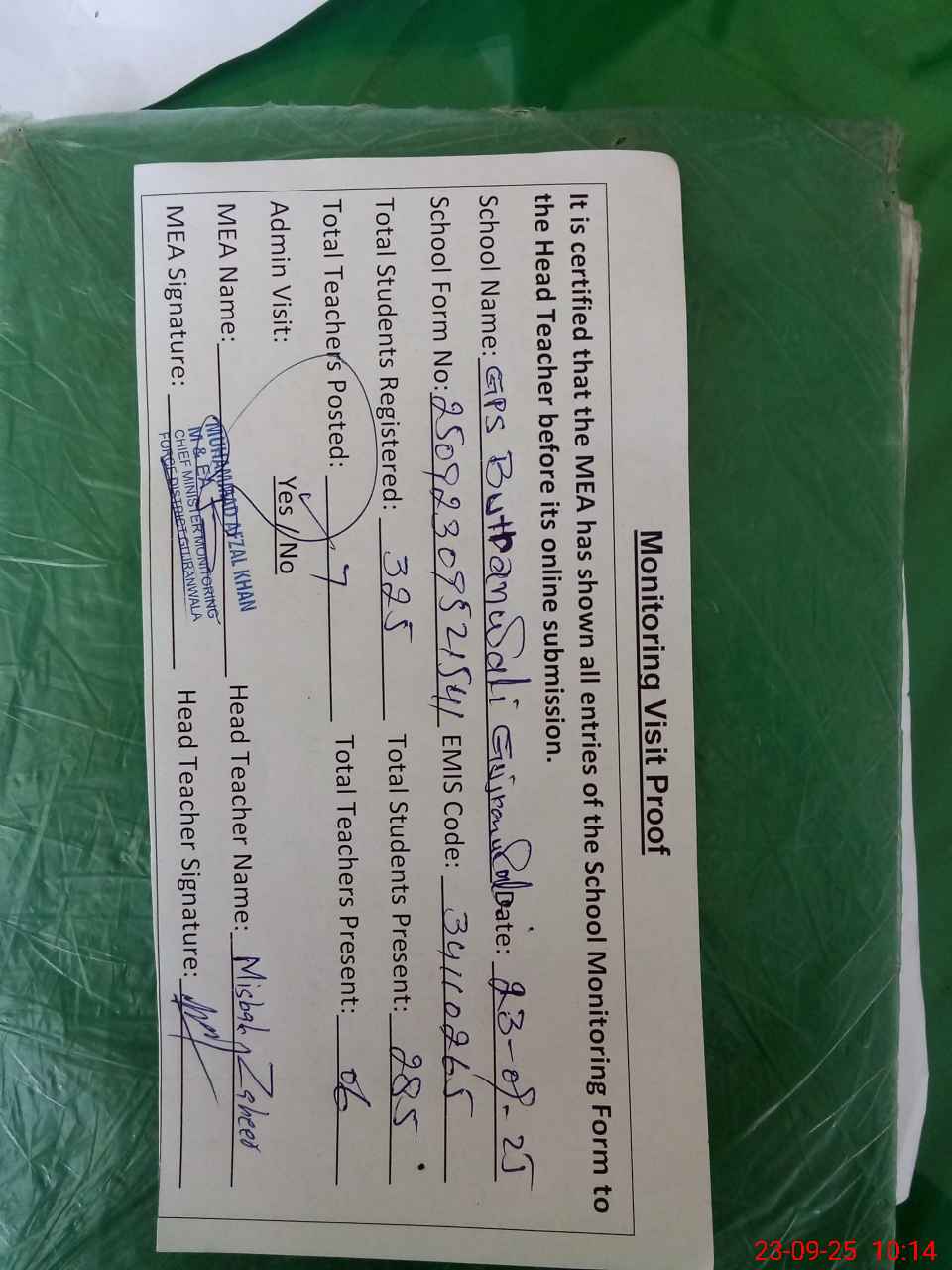 | Certified that this School was Inspected by the Undersigned MEA/DMO Today and the Information Stated Above is as Per Record. | |||||