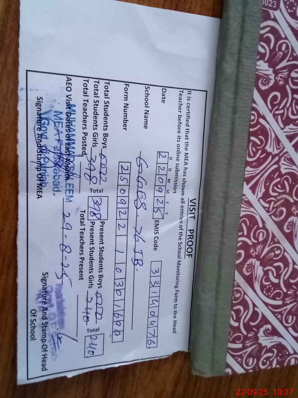 | Certified that this School was Inspected by the Undersigned MEA/DMO Today and the Information Stated Above is as Per Record. | |||||