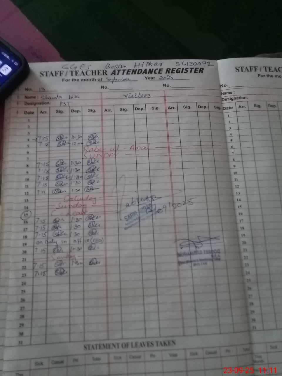 | Name: AZ**** KO**** Designation: (School Headmaster's/Headmistress's) INCHARGE EST Phone/Cell Number: 03**** |