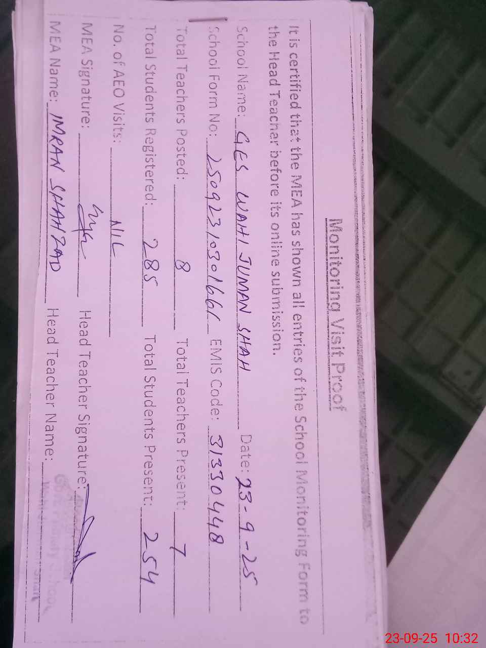 | Attendance Register | Head Teacher | MEA with School | Visit Proof |