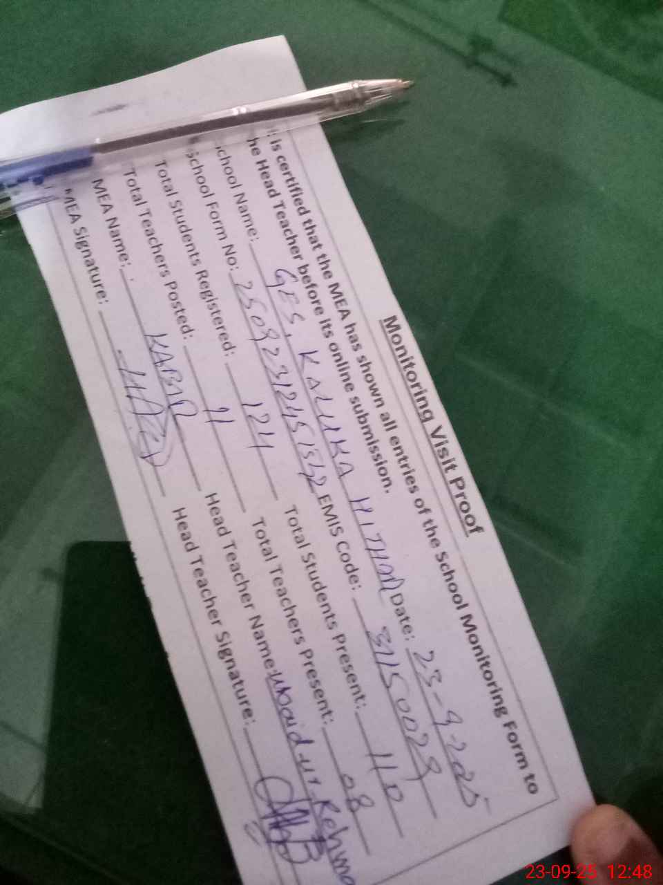 | Attendance Register | Head Teacher | MEA with School | Visit Proof |