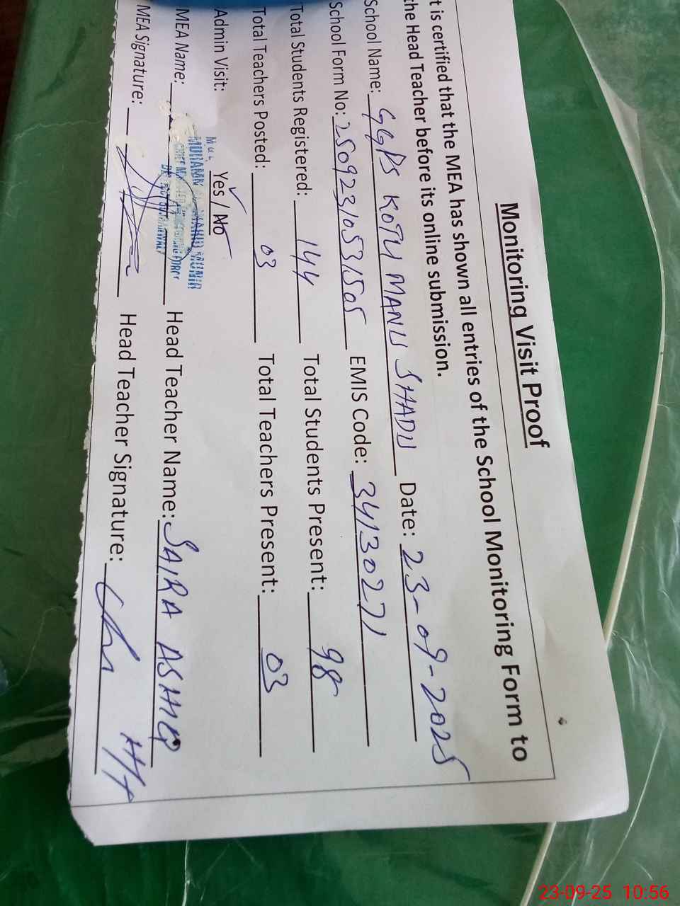 | Attendance Register | Head Teacher | MEA with School | Visit Proof |