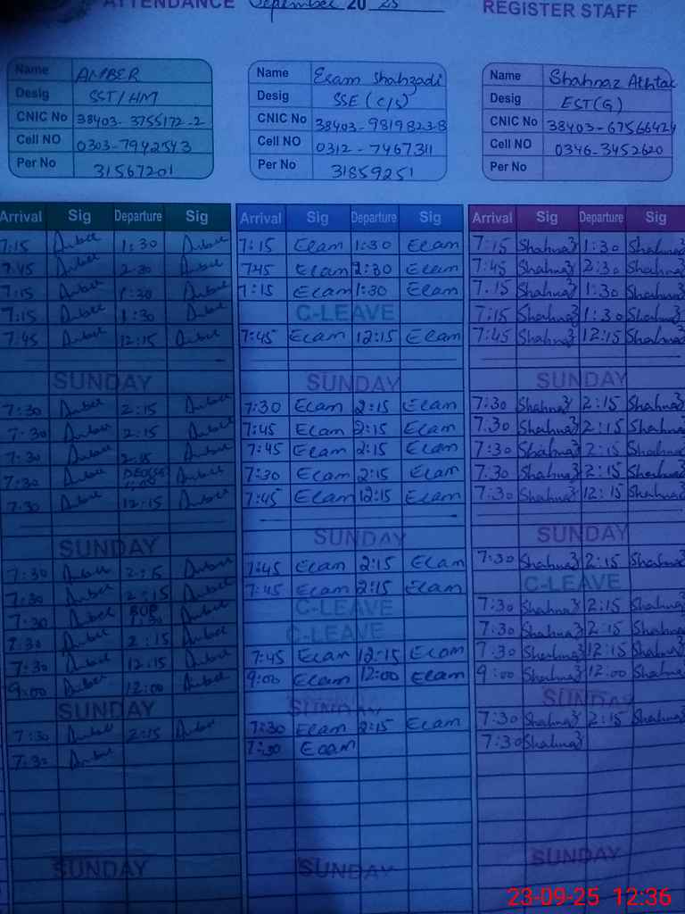 | CNIC | Full Name | Designation | R/C | Absence During Last Calender Month |