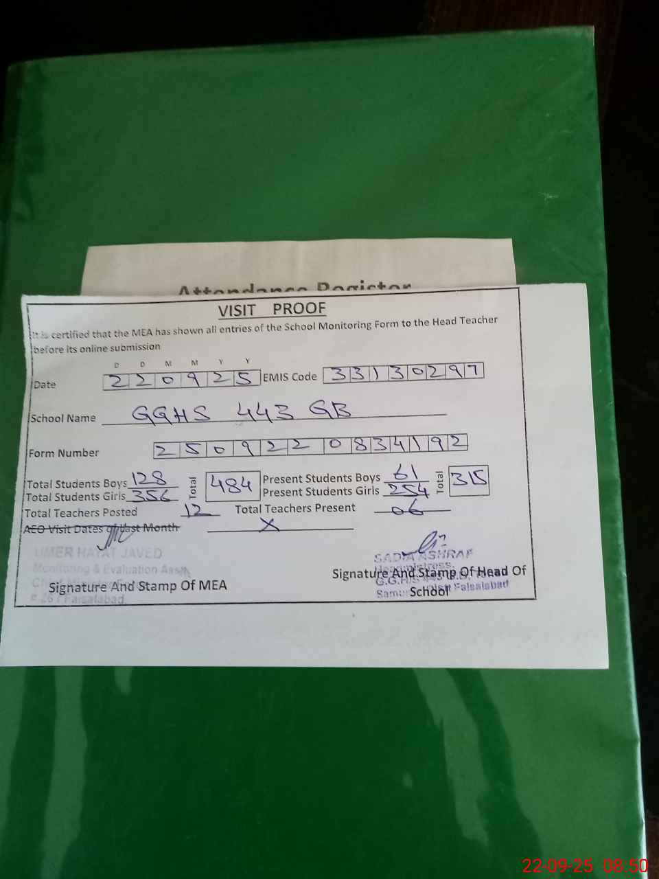 | Attendance Register | Head Teacher | MEA with School | Visit Proof |