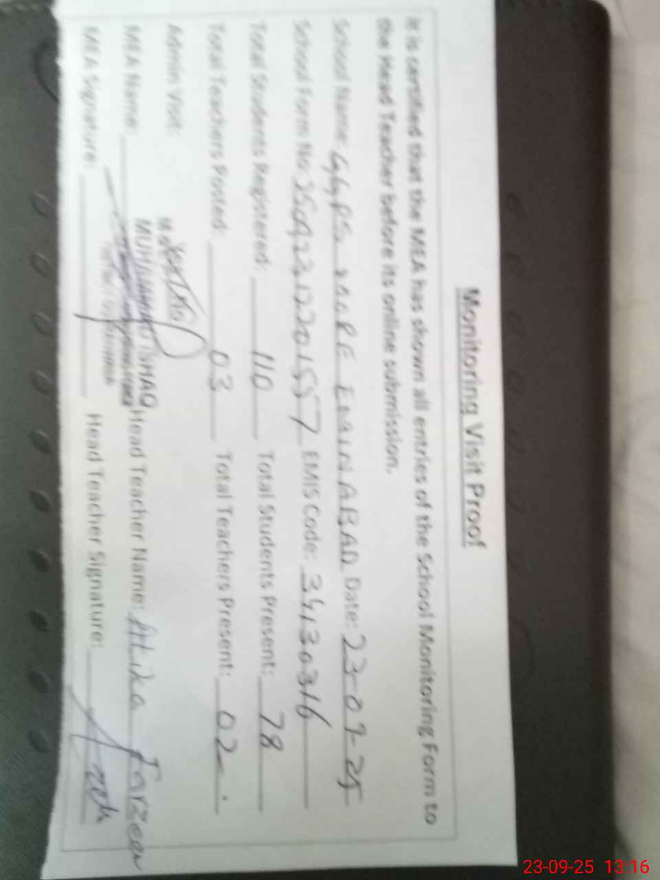 | Attendance Register | Head Teacher | MEA with School | Visit Proof |