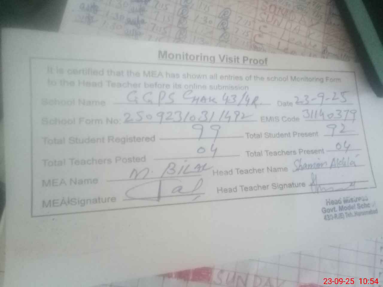| Attendance Register | Head Teacher | MEA with School | Visit Proof |
