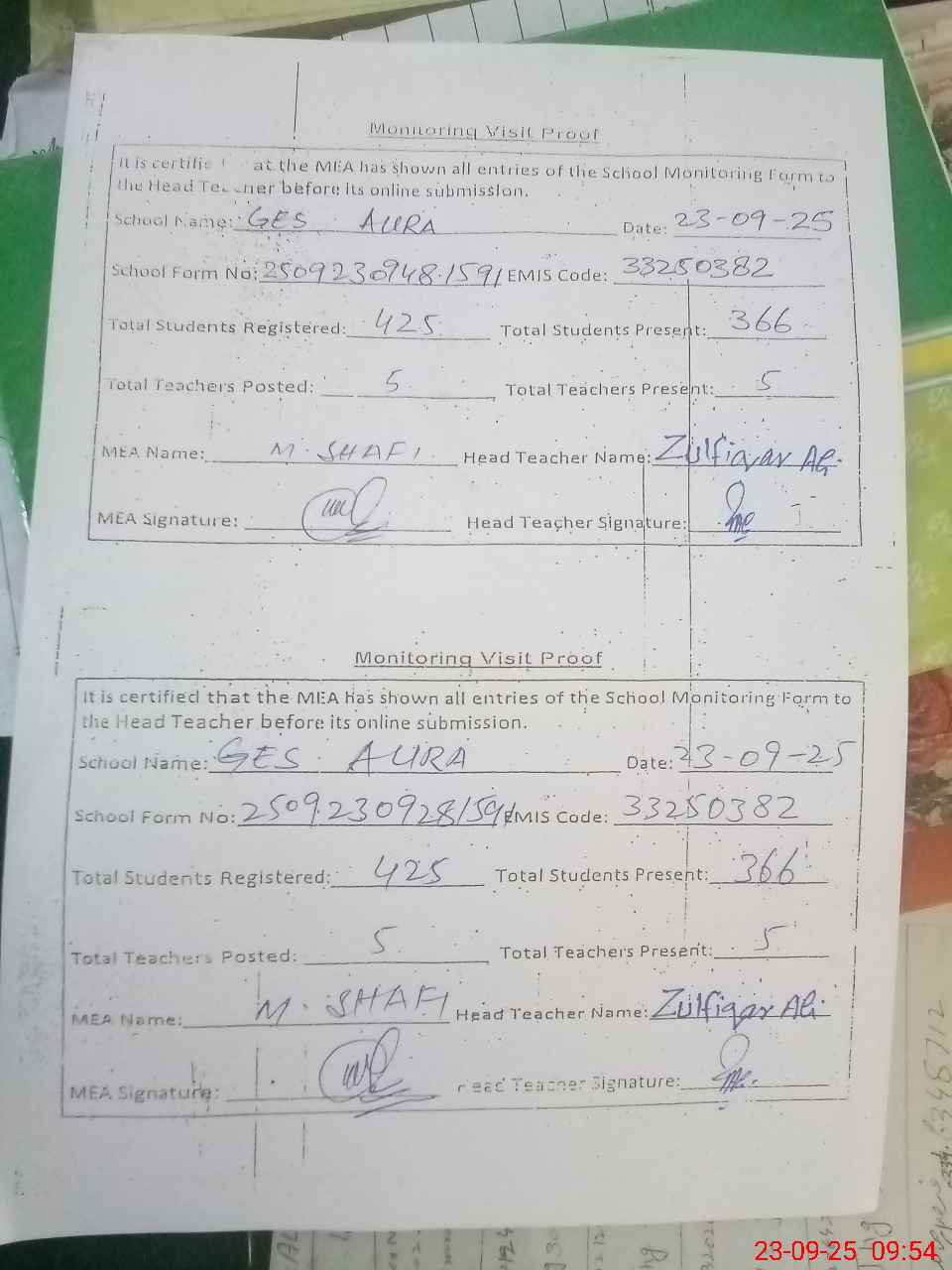 | Attendance Register | Head Teacher | MEA with School | Visit Proof |