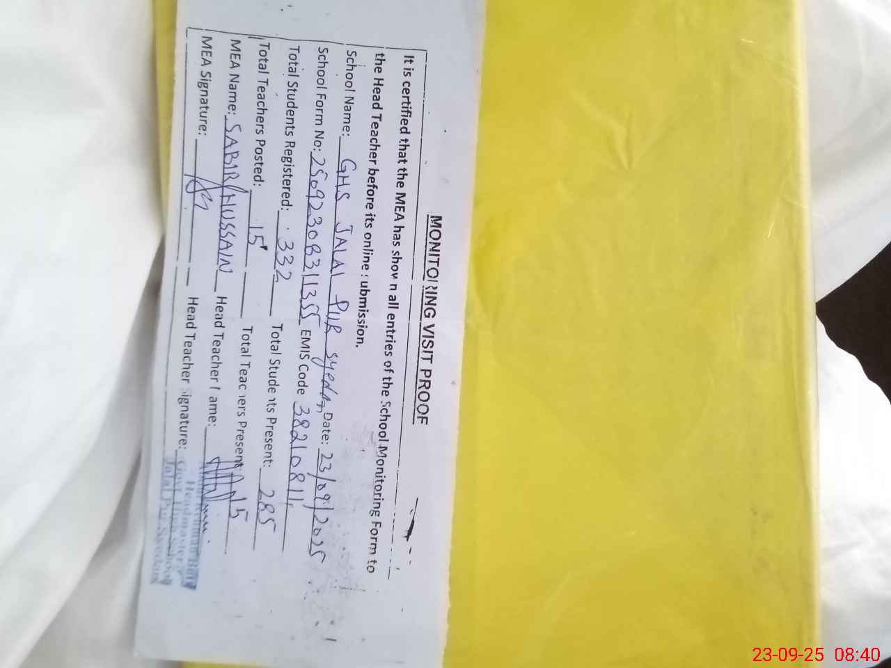 | Attendance Register | Head Teacher | MEA with School | Visit Proof |