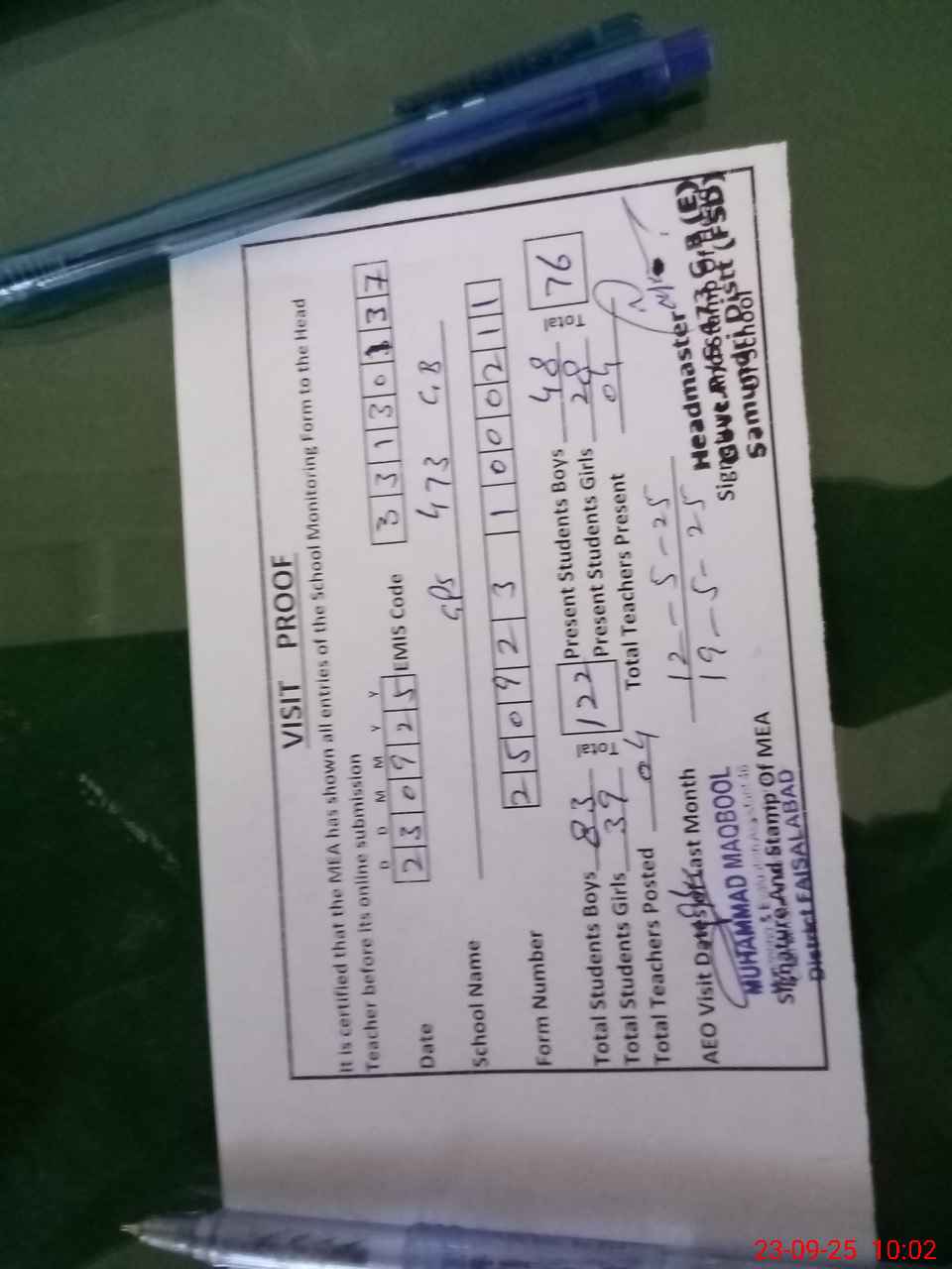 | Attendance Register | Head Teacher | MEA with School | Visit Proof |