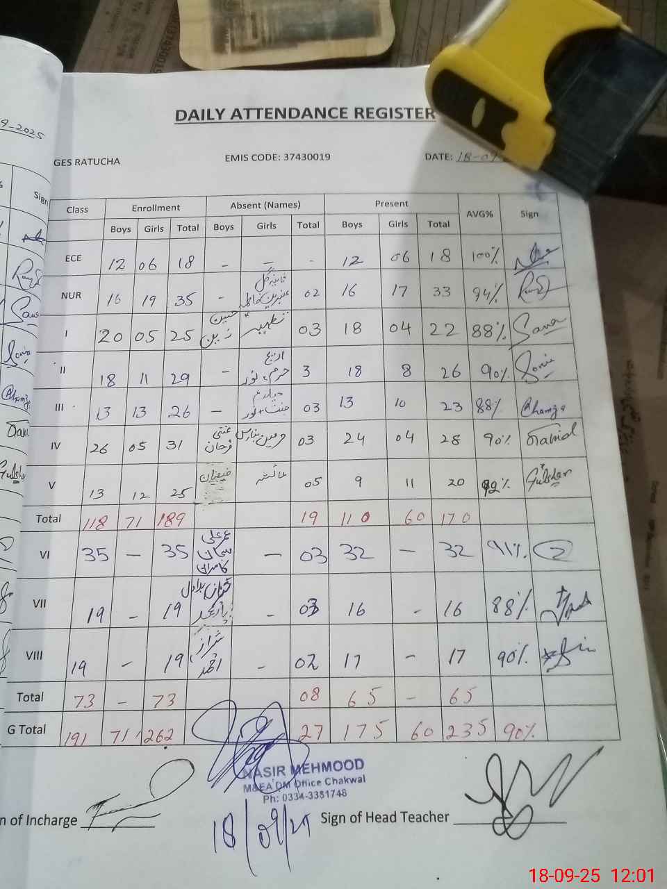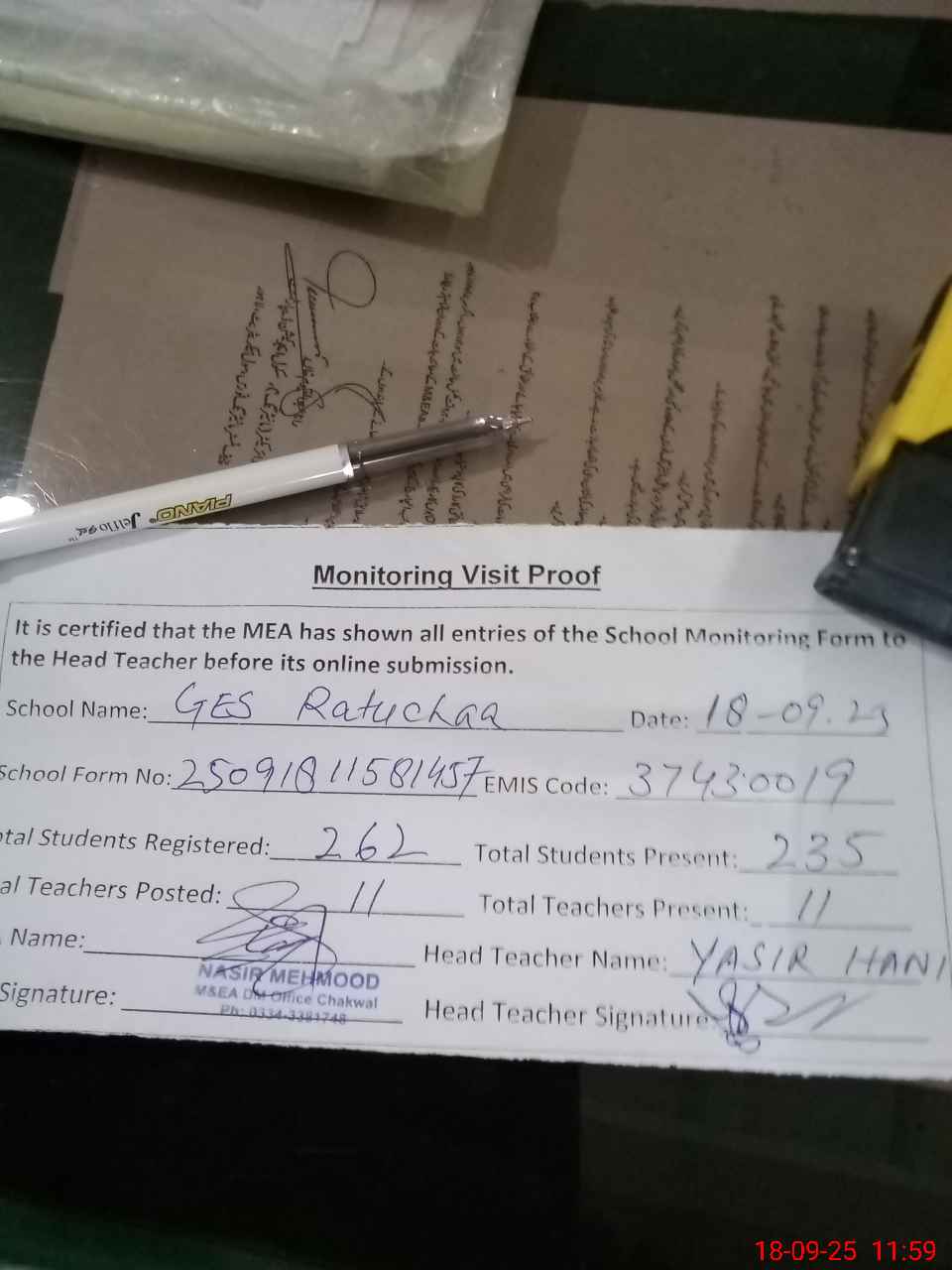 | Attendance Register | Head Teacher | MEA with School | Visit Proof |