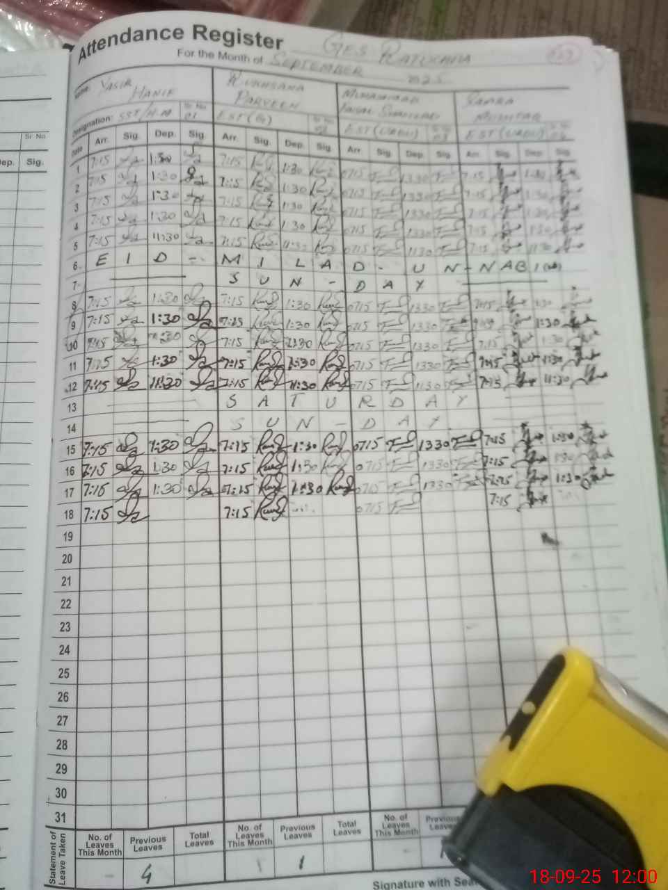 | CNIC | Full Name | Designation | R/C | Absence During Last Calender Month |