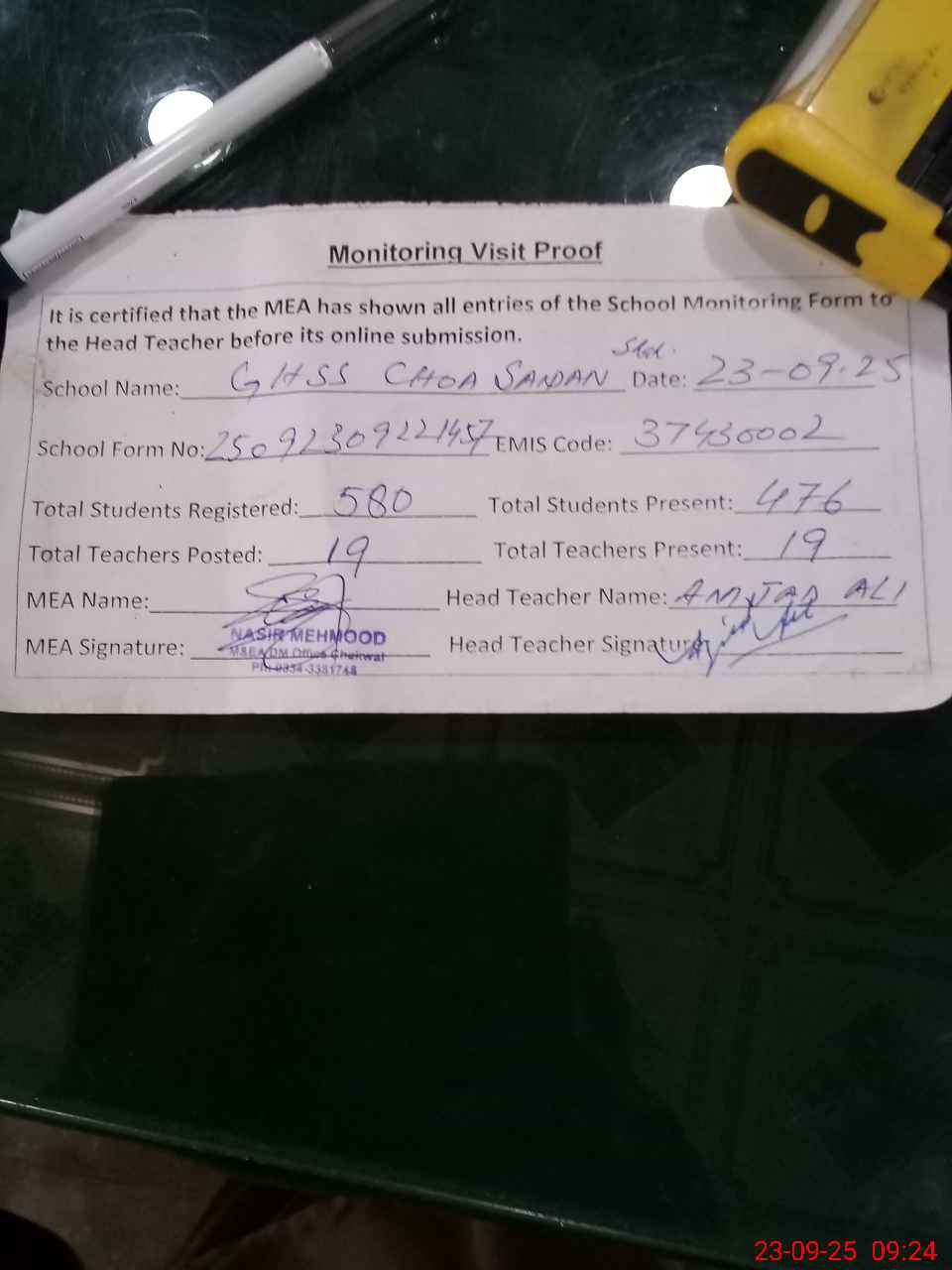 | Attendance Register | Head Teacher | MEA with School | Visit Proof |