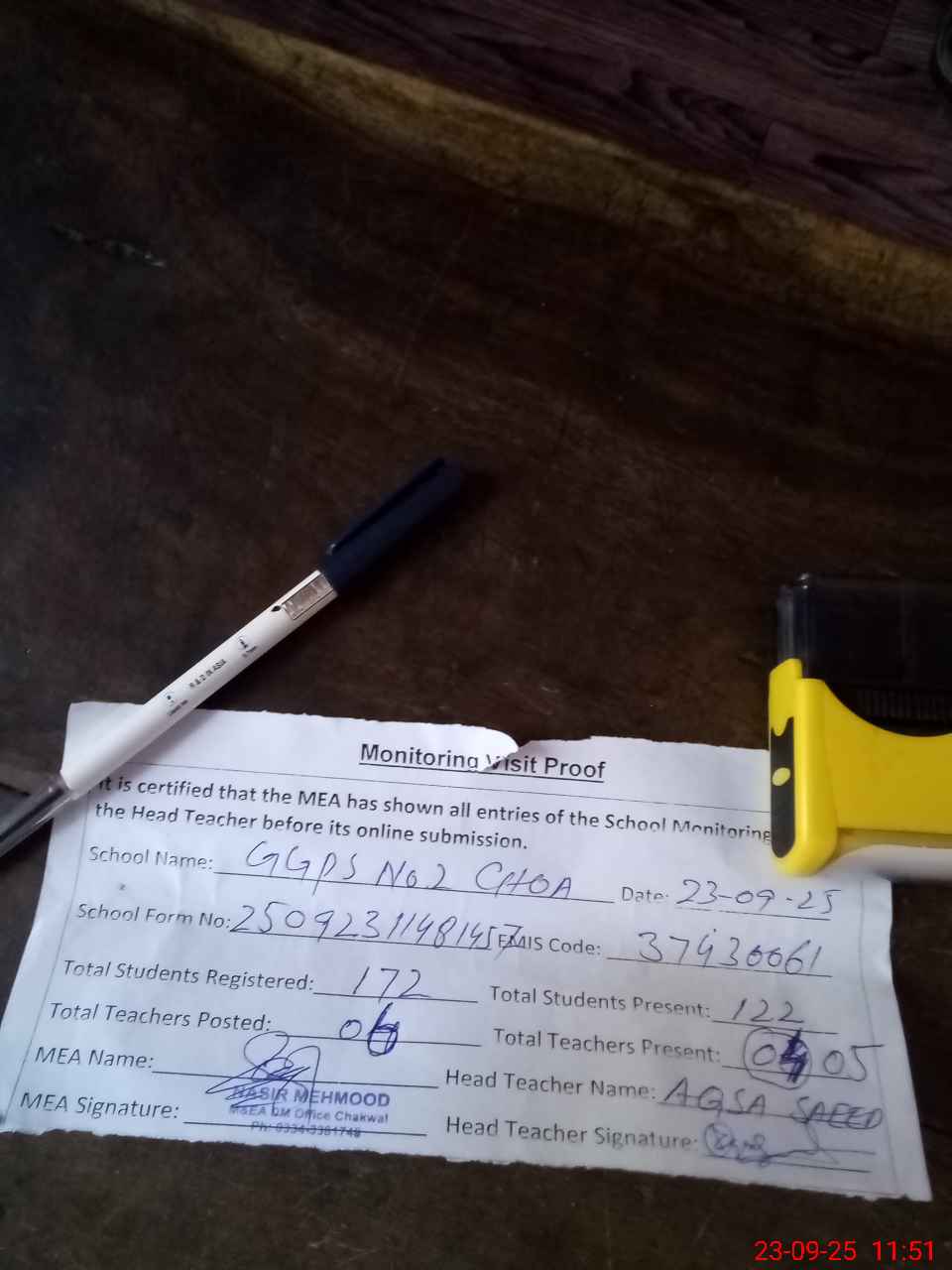 | Attendance Register | Head Teacher | MEA with School | Visit Proof |
