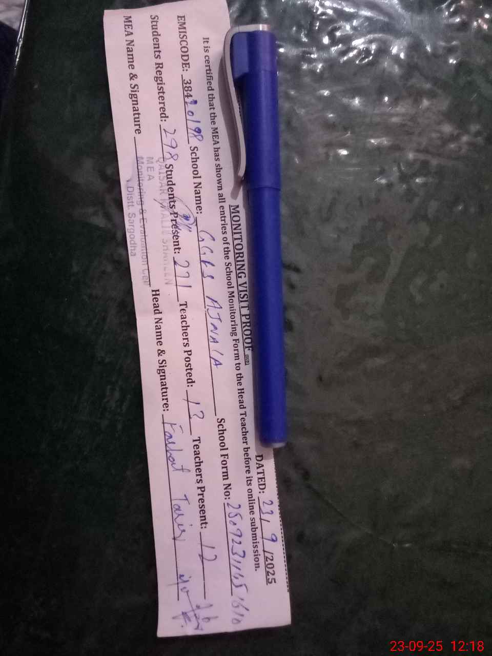 | Attendance Register | Head Teacher | MEA with School | Visit Proof |