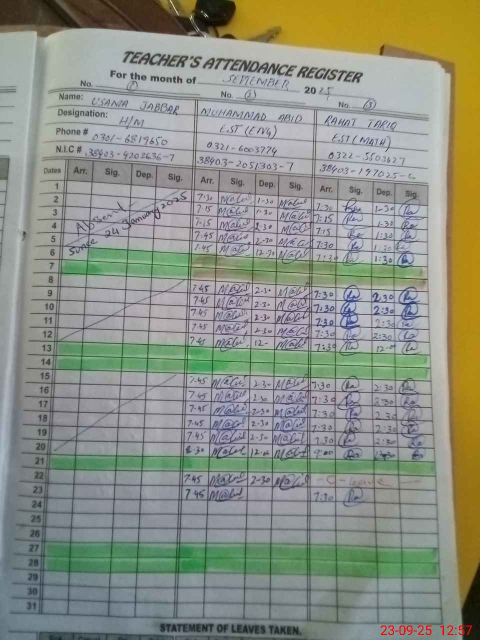 | CNIC | Full Name | Designation | R/C | Absence during last cal. month |