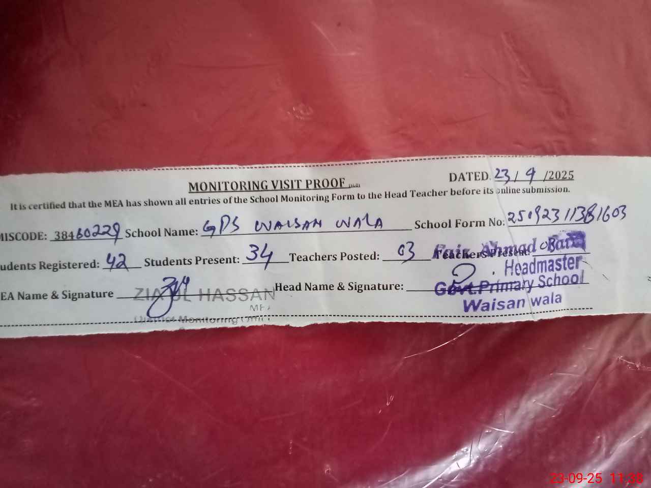 | Attendance Register | Head Teacher | MEA with School | Visit Proof |