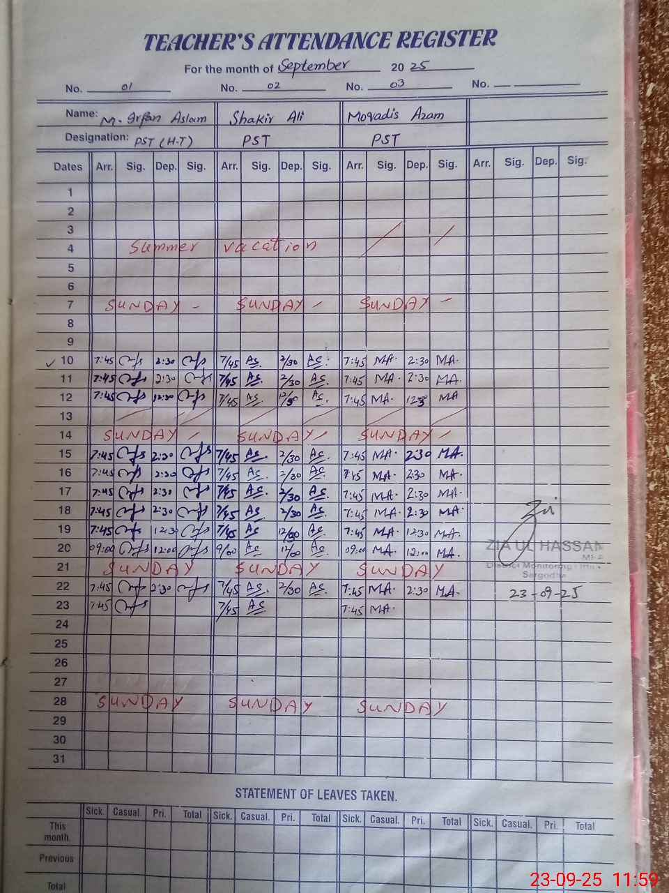 | Monitoring Date: 23-09-2025 | Start Time: 23-09-2025 11:44 AM | End Time: 23-09-2025 12:01 PM | Name of MEA: ZI**** ULHA**** | |