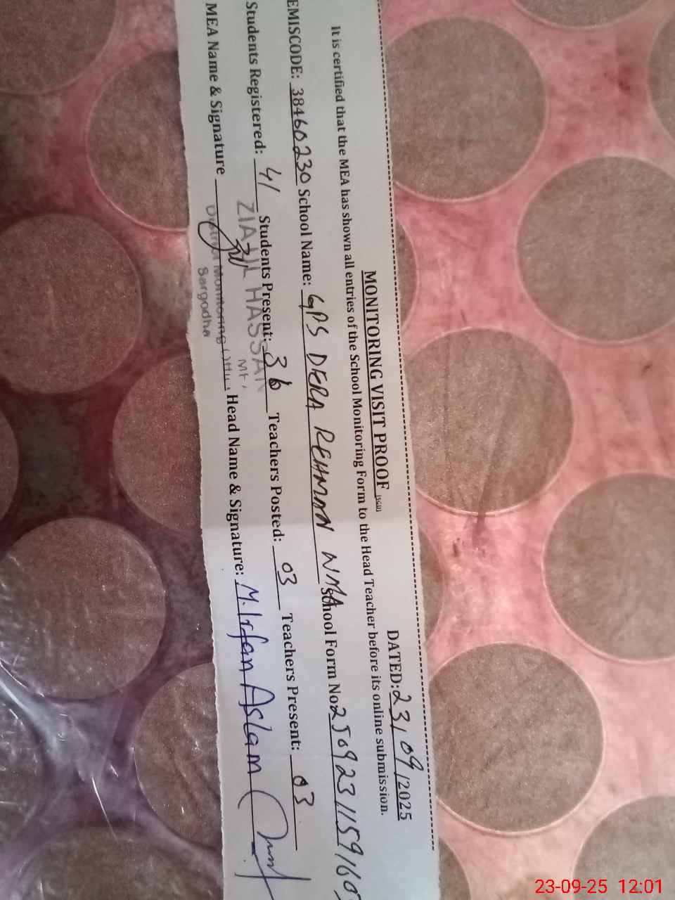 | Attendance Register | Head Teacher | MEA with School | Visit Proof |