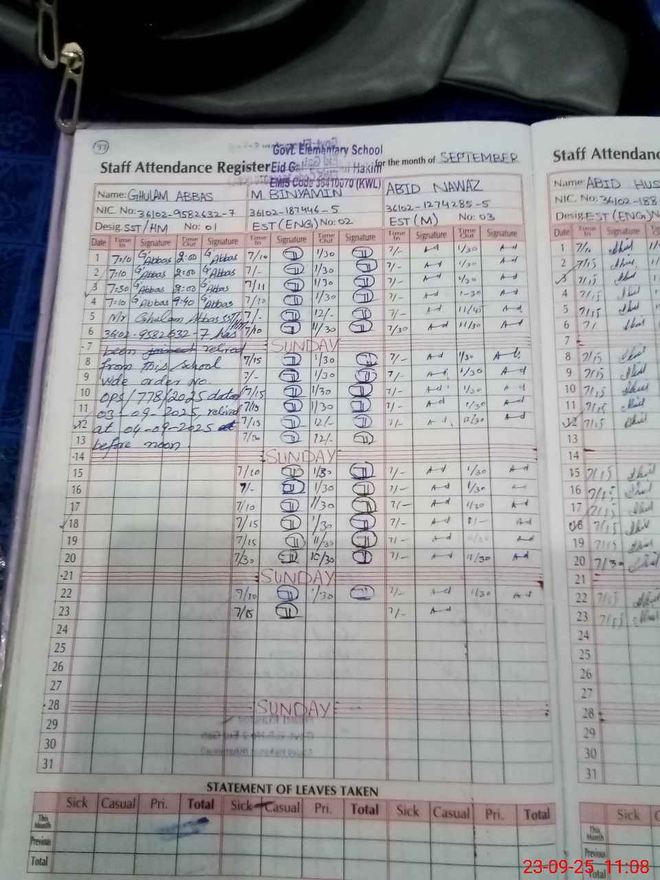 | CNIC | Full Name | Designation | R/C | Absence During Last Calender Month |