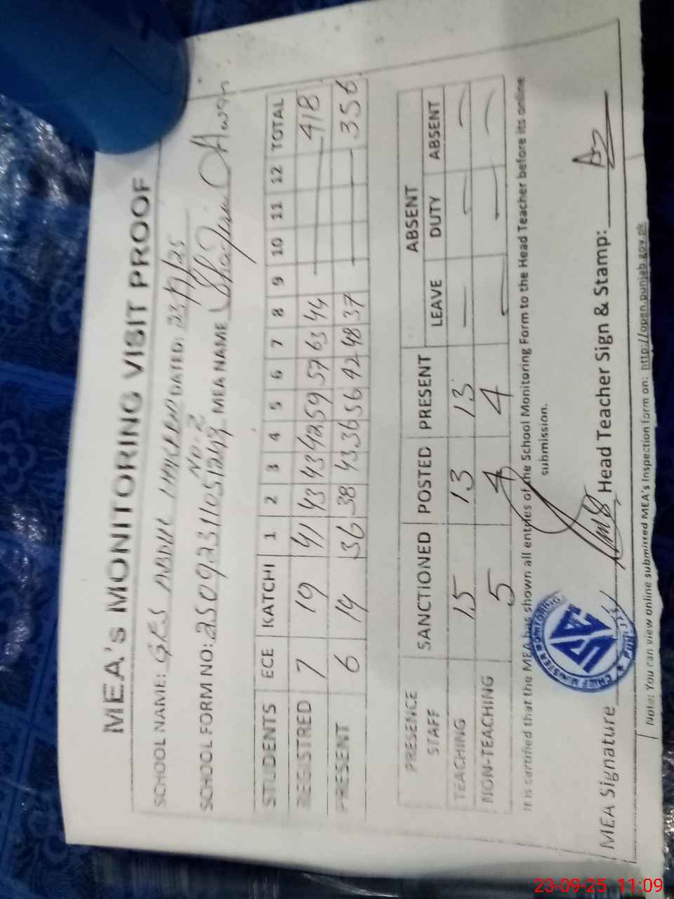 | Attendance Register | Head Teacher | MEA with School | Visit Proof |