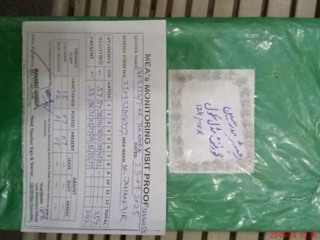 | Attendance Register | Head Teacher | MEA with School | Visit Proof |