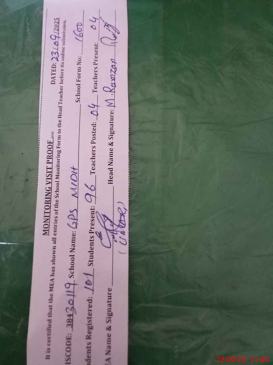 | Attendance Register | Head Teacher | MEA with School | Visit Proof |