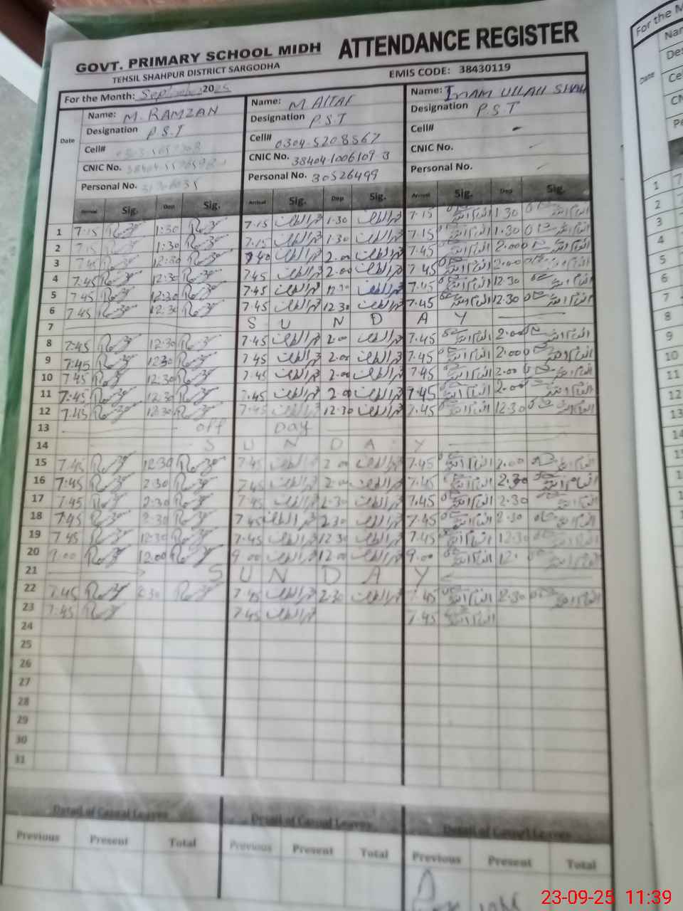 | CNIC | Full Name | Designation | R/C | Absence during last cal. month |