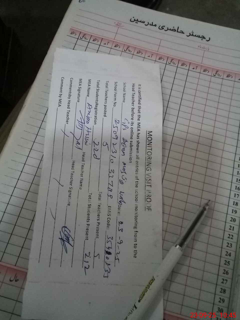 | Attendance Register | Head Teacher | MEA with School | Visit Proof |