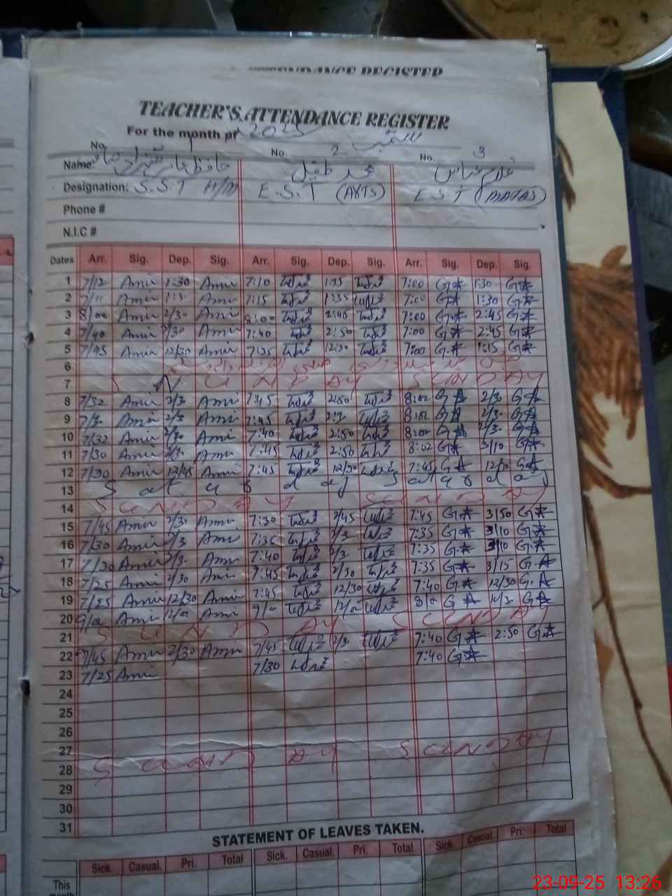 | CNIC | Full Name | Designation | R/C | Absence During Last Calender Month |