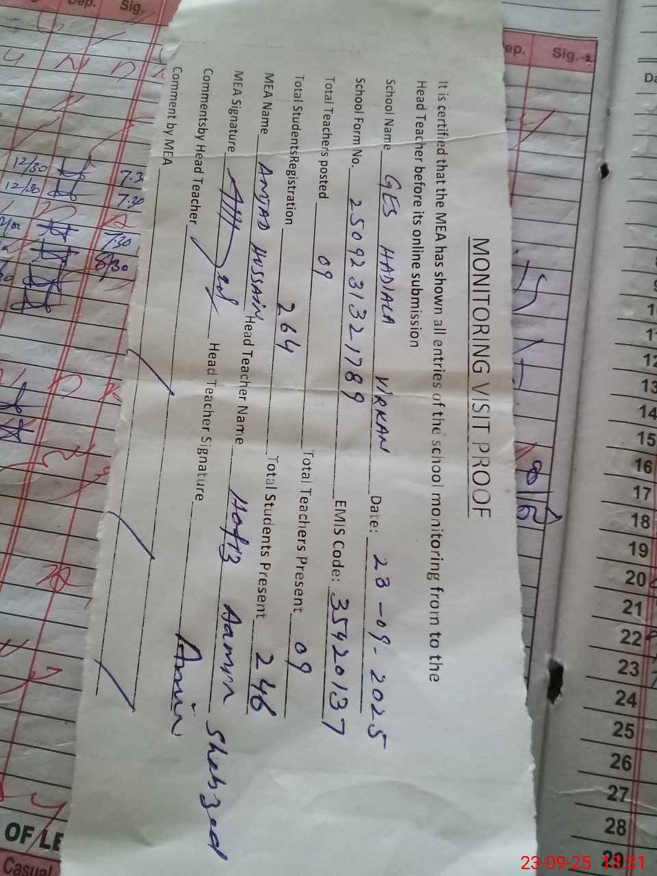 | Attendance Register | Head Teacher | MEA with School | Visit Proof |